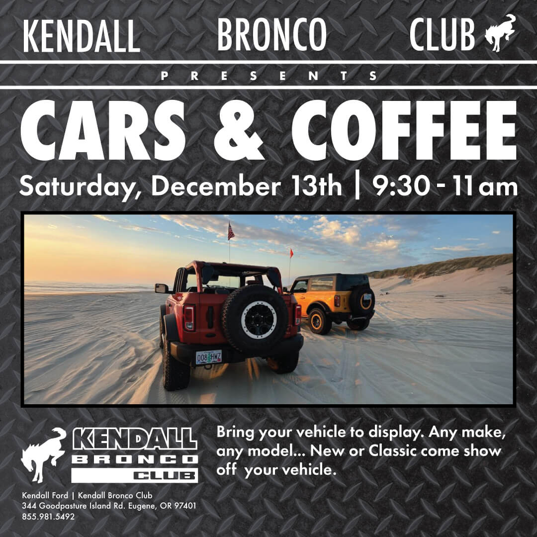Kendall Bronco Club of Eugene will be hosting our next Cars & Coffee on Saturday, December 13th from 9:30 AM – 11:00 AM.