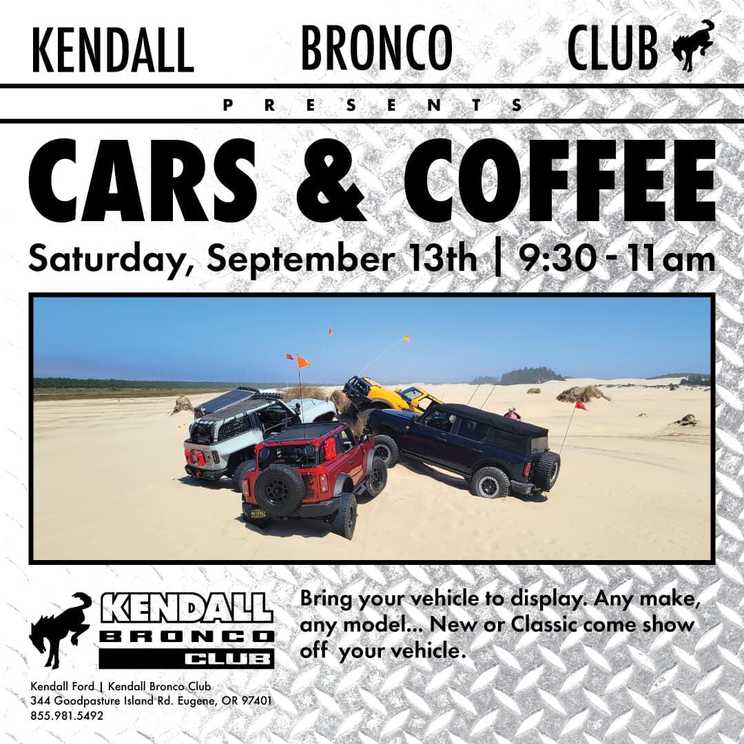 Kendall Bronco Club of Eugene will be hosting our next Cars & Coffee on September 13th from 9:30 AM – 11:00 AM.